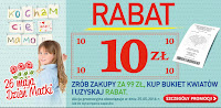 Akcja obowiązuje tylko w dniu 25 maja. Wracając jednak do oferty na Dzień Mamy polecamy bukiet róż 11 szt. - 6,99 zł, bukiet z frezją - 9,99 zł oraz bukiet tulipanów 9 szt. w cenie 8,99 zł. Z pozostałych prezentów polecamy Ptasie Mleczko E.Wedel - 8,99 zł, krem nawilżający Garnier Skin Naturals - 7,99 zł oraz wodę perfumowaną Bi-es 100 ml za jedyne 9,99 zł.
